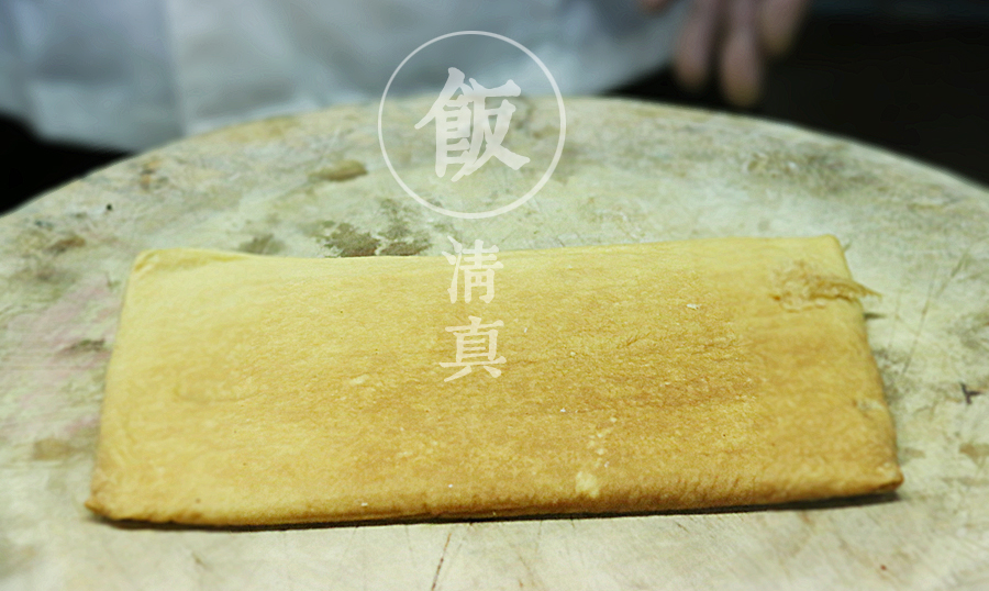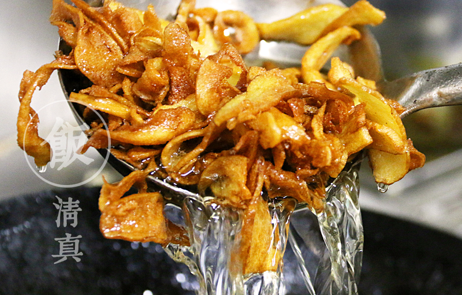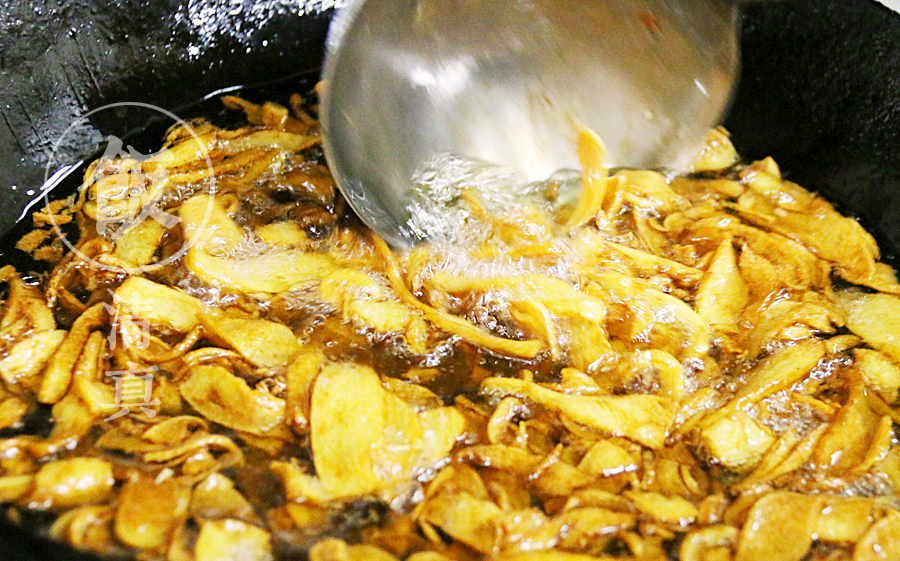 將一整塊的咯吱塊切成片,然后熱油炸,大小火幾次轉(zhuǎn)換,等外脆里嫩了就撈出備用。