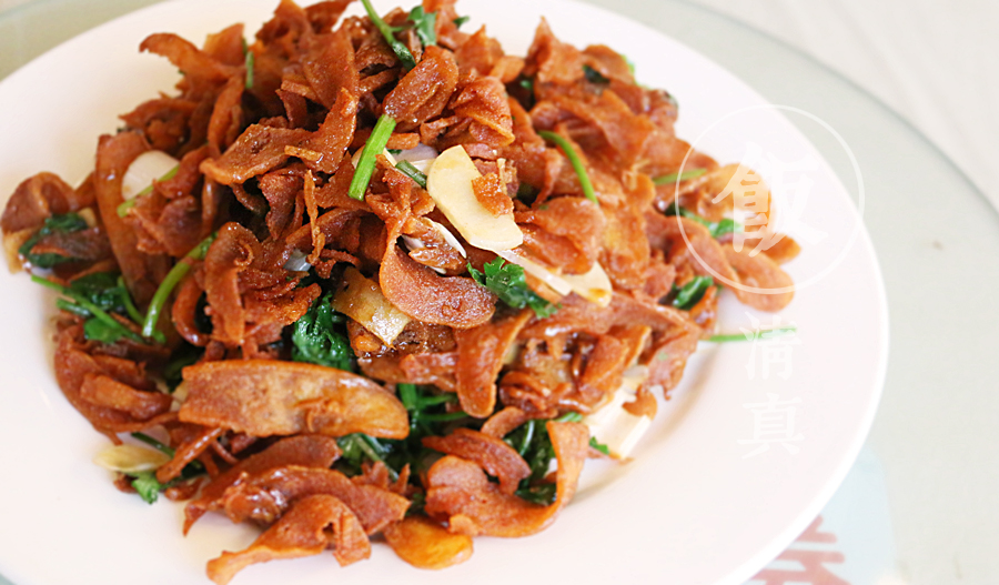 蔥姜蒜香菜幾種普通的輔料做汁,調(diào)上醬油、醋、胡椒粉、淀粉、鹽,與炸好的咯吱一同在鍋中翻炒,一道“焦炒咯吱”就做成了。咯吱入口很脆,帶著蒜香與蔥香??诟懈拖憔椭坏莱床说奈兜篮芟嗨啤R驗椴辉鴩L過其它地方的焦炒咯吱,也無法做比較,只是覺得口味獨特好吃。后來帶了些回去給老趙,作為地道的北京人,它對這道菜很是稱贊,說已經(jīng)算是北京焦炒咯吱里的上品了。
