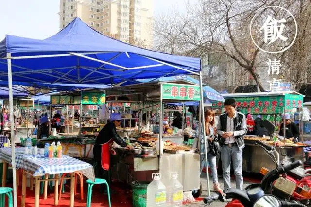 走到朝陽西路的另一頭,一整片的燒烤攤就呈現(xiàn)在眼前了。這里最起碼大大小小有三四十家小攤位,攤主清一色都是帶著藍色帽子的吳忠回民阿娘,這些小攤,所賣大致分為三類,燒烤關(guān)東煮,涼面,煎餅果子。