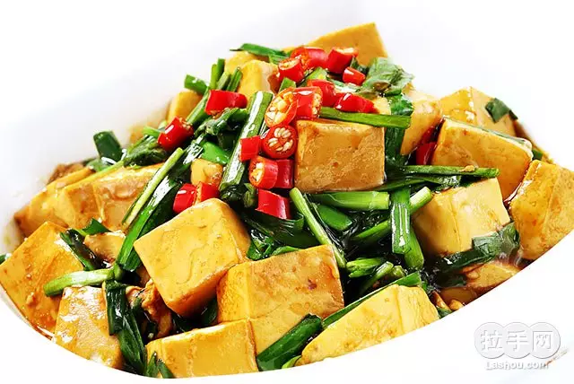 4、加入鹽和適量的清水燜至豆腐入味,再放入蒜苗,雞精和香油,淋入水淀粉翻炒均勻關(guān)火。