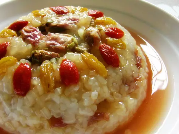 材料:糯米300g、紅棗幾顆、葡萄干適量、枸杞適量、白糖30g、紅豆沙適量
