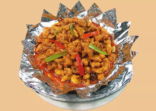 4、下入炸好的雞塊燒開,撇凈浮沫,加醬油、精鹽,用小火燜至酥爛,加味精,收濃湯汁,勾芡,淋芝麻油,裝盤即成。