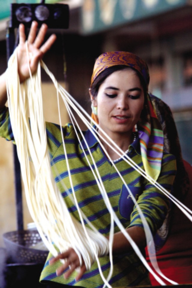 早餐吃馕喝茶或“烏馬什”(玉米面粥),中午為面類主食,晚飯是湯面或馕茶。吃飯時(shí)一家大小共席而坐,吃完飯,在拿走餐具前,由長(zhǎng)者帶領(lǐng)大家作“都瓦”(祈禱),然后離席。