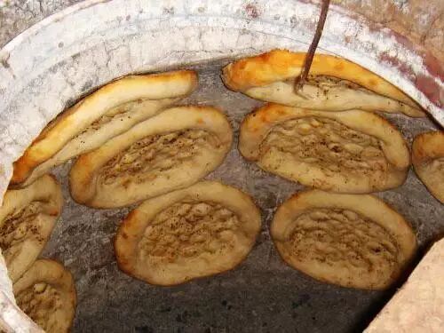 烤包子維吾爾語(yǔ)稱“沙木沙”。用羊肉、羊尾油、洋蔥(皮牙子)等做成餡心。再用面皮包成方形,放入馕坑烤熟即成。