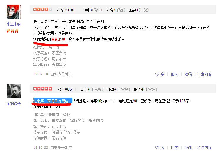 另外,有朋友問全聚德的烤鴨是否清真,當(dāng)然不是清真,如果是清真,憑人家的知名度和號召力,還用得著小編在這里費勁嘛~
