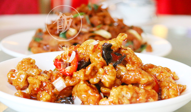 八塊雞的菜名可能會容易誤導大家,其實就是魚香焦炒雞塊。這是聚德香苑的獨家菜,是用去骨的雞腿肉做成的。這是一道色香味俱全的菜,一端上桌,就勾起食欲來。吃過魚香肉絲的一定能想象的來,這道菜口味偏酸甜,夾一塊放嘴里,先就是這包裹在炸雞塊上的酸甜味刺激味蕾,然后一口咬下去,雞肉外皮的香脆和內(nèi)里的酥嫩一并全部充斥口腔。感嘆之余,就是無法停箸。