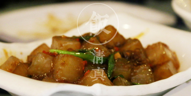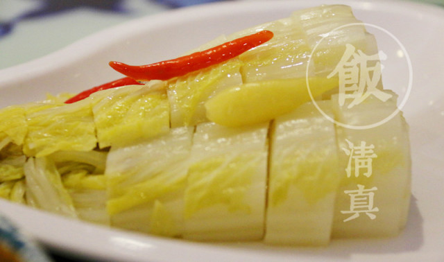 先上了一道西北酸菜,大白菜切塊腌制成的酸菜,在西北幾乎是家家戶戶的最愛。記得小時候,家里一次都能腌一缸,這樣,便有了一個冬天的享受,無論是煮洋芋,還是吃肉,酸菜都是再好不過的配菜。撒拉花兒的酸菜很正宗,與西北當?shù)氐臎]有差別,酸中帶著點小小的辣。