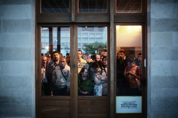 《門(mén)里的人們》,記錄的是人們?cè)谝了固共紶枤W洲一側(cè)等待乘坐渡輪去往亞洲的場(chǎng)景。這里小小科普一下,伊斯坦布爾是世界上唯一一座橫跨兩大洲的大城市,被博斯普魯斯海峽分隔——一側(cè)為歐洲一側(cè)為亞洲,在歐洲區(qū)的上班族每天傍晚會(huì)乘坐渡輪返回亞洲居住區(qū),形成住在亞洲、工作在歐洲的奇特景象。碼頭等候廳里的上班族們,男女老少,神情各異,門(mén)框形成了“鏡框”,勾勒出一幅伊斯坦布爾人的生動(dòng)集體肖像。圖里有亮點(diǎn),發(fā)現(xiàn)“普京”沒(méi)?