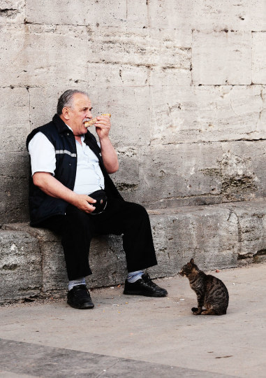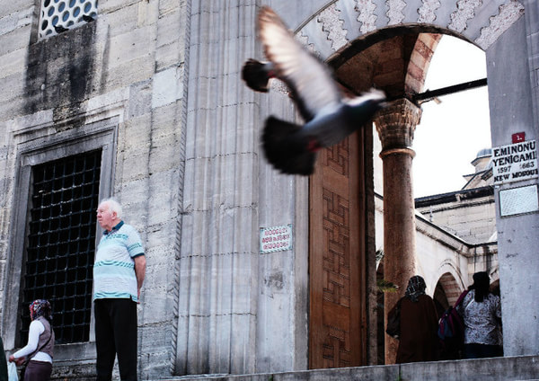 在伊斯坦布爾不能不看清真寺。這張照片是耶尼清真寺一瞥,有鴿子略過(guò),有來(lái)往的行人和駐足的老人