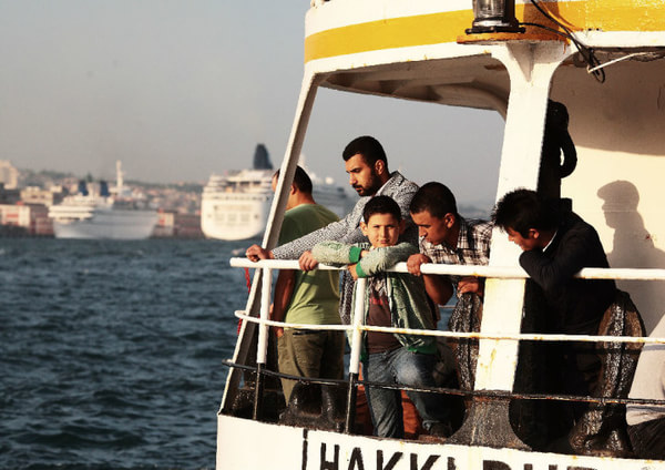 這一幅《船尾的人》也與渡海有關(guān),則是將場(chǎng)景移到港起航的渡輪上。穆斯塔法們(土耳其最最常見(jiàn)男名,呵呵)在甲板上吹著海風(fēng),聽(tīng)著浪聲。船尾的幾個(gè)人中,似乎大多數(shù)在低頭海水發(fā)呆,一個(gè)小男孩卻在向前看著,你能很明顯地感覺(jué)到他的目光成為這幅作品的焦點(diǎn),似乎能穿透照片。